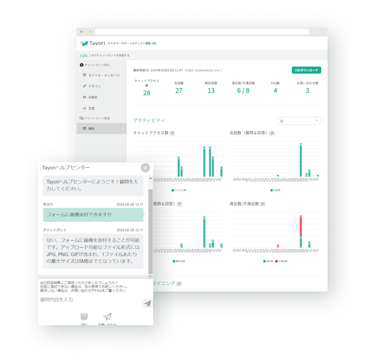 月1万円で導入を実現。FAQがあれば3分で設置コードを作成可能。FAQの更新内容が反映されるので管理も簡単。利用状況を可視化する管理画面搭載。LINE公式アカウントと連携も。